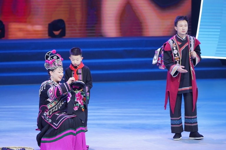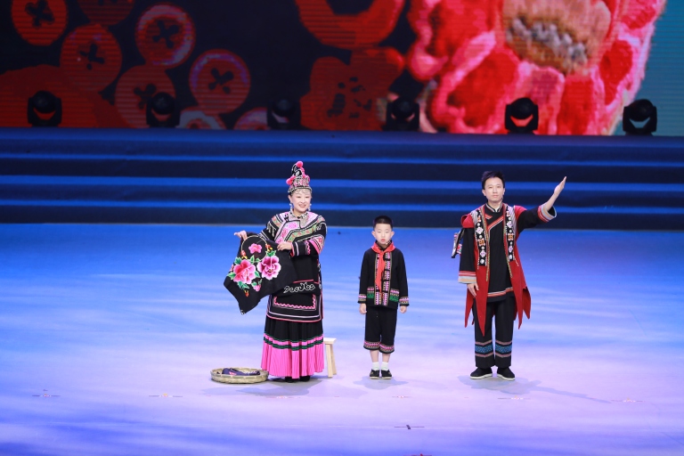 在本次全国性展示活动中,荀宥杰家庭表演了两个富有教育意义的节目。情景剧《檐下春秋》生动讲述了彝族妇女阿凤在儿子——我校"推普小能手"朗朗(荀宥杰饰)的影响下,勇敢学习普通话,一家人通过网络直播将彝绣技艺推向世界的故事,展现了语言相通消除贫困代际传递、文化赋能激活乡村振兴、民族团结共绘小康画卷的百姓日常。该节目时长4分钟,巧妙融入了我校开展的"小手拉大手 学讲普通话"活动元素,展现了语言文字学习如何成为连接家庭与时代的纽带。
