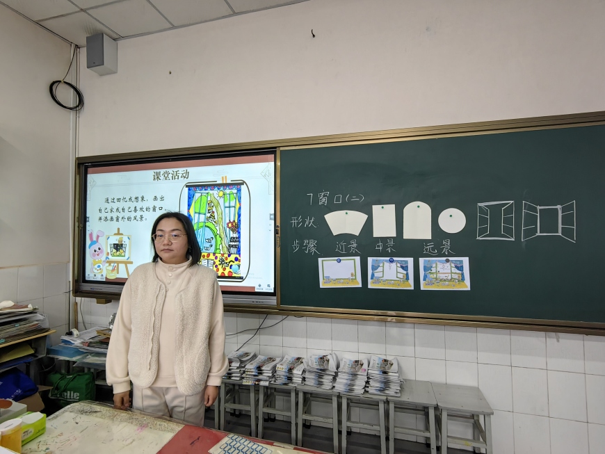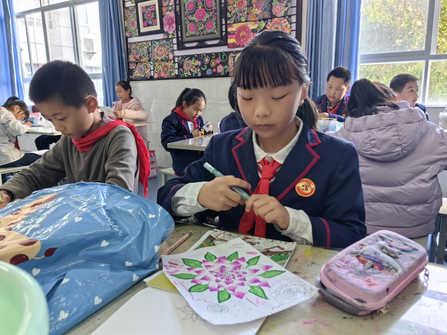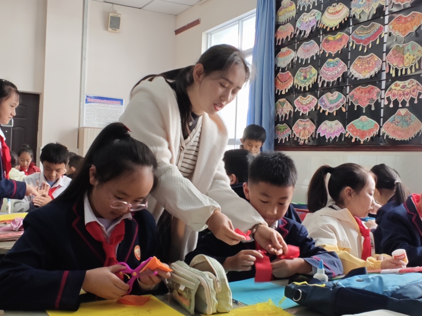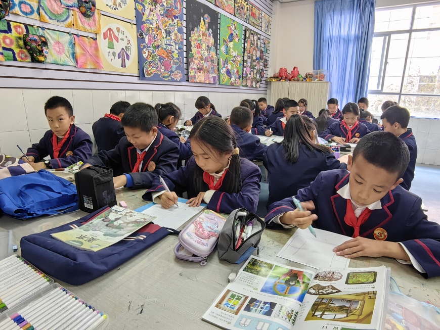 在美术课堂上,跟岗教师们近距离观摩资深教师如何将抽象的艺术理念转化为具象的教学实践。从趣味导入激发学生创作兴趣,到分层示范讲解绘画技巧、手工步骤,再到个性化点评引导学生优化作品,授课教师始终以学生为中心,注重启发式教学与创造性思维培养。跟岗教师们认真记录教学环节设计、重难点突破方法。