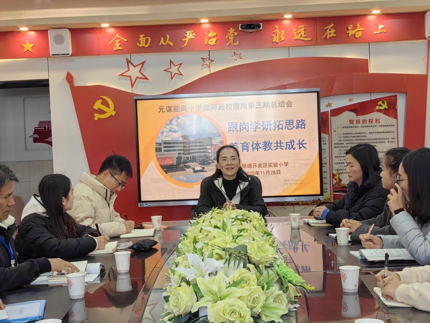 2025年11月24日至28日,元谋能禹小学教师团队赴楚雄开发区实验学校开展为期五天的跟岗研修活动。楚雄实验小学以“全方位、沉浸式”的交流模式,通过校园文化观摩、学科课堂展示、特色活动参与等多元环节,助力来访教师精准把握优质教育的实践路径。