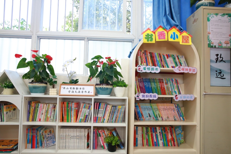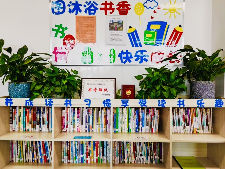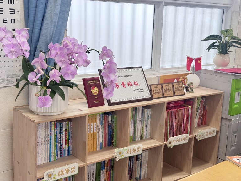 课间的四 7 班教室一角,“书香小屋” 总能留住几个驻足的身影。透亮的窗棂边,红掌与兰草舒展着枝叶,和书架上斑斓的书脊相映成趣。拱形书架顶的彩色小屋标牌下,“爱惜图书”“安静阅读” 的提示牌像温柔的约定。