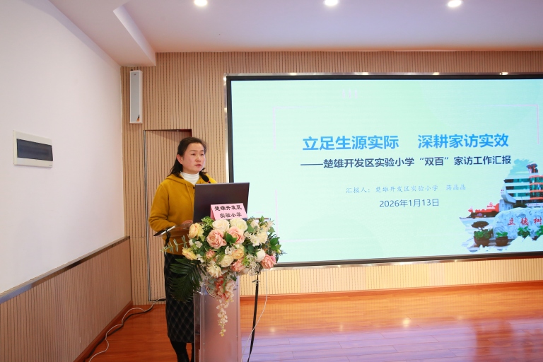楚雄开发区实验小学蒋晶晶副校长代表学校作“双百”家访工作经验介绍,从“健全工作机制、精准摸排部署、创新家访形式、强化成果转化”四个方面,详细分享了学校开展“双百”家访工作的具体做法,重点介绍了学校在特殊学生群体关爱、家校沟通渠道拓宽、育人合力凝聚等方面的实践经验,得到了与会人员的广泛认同。