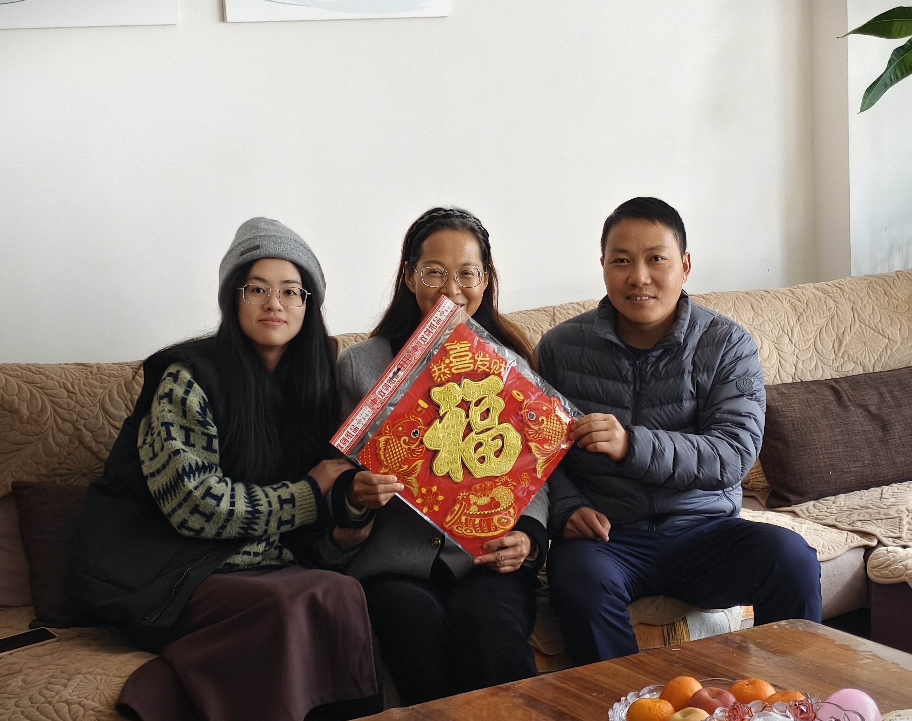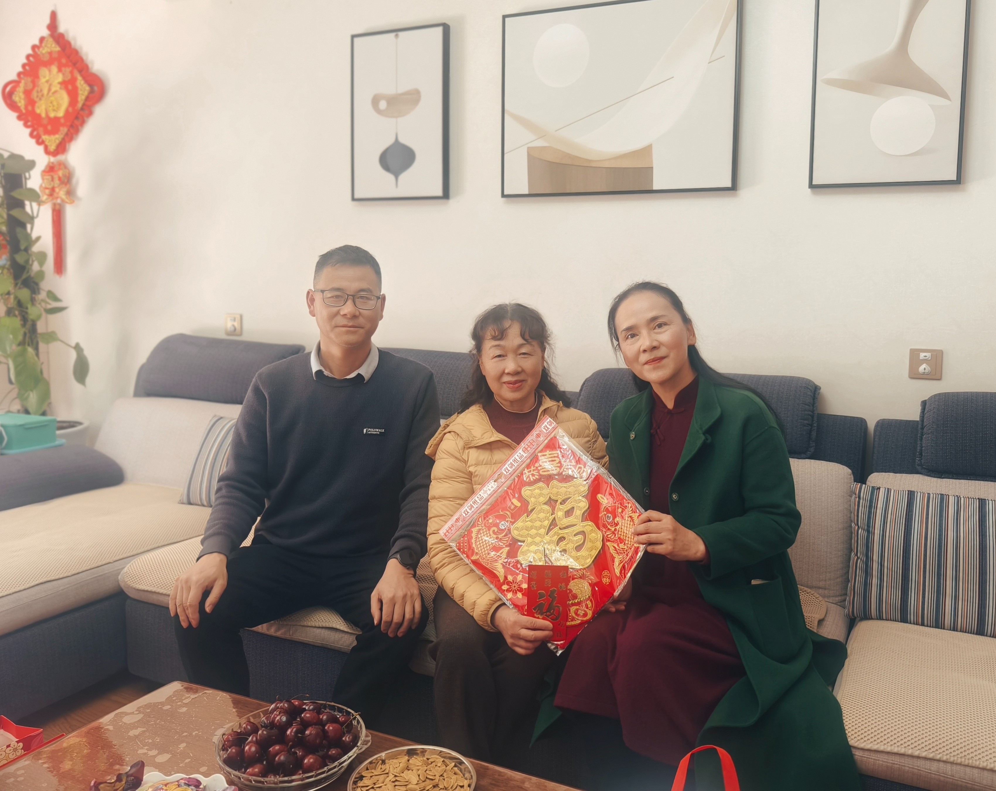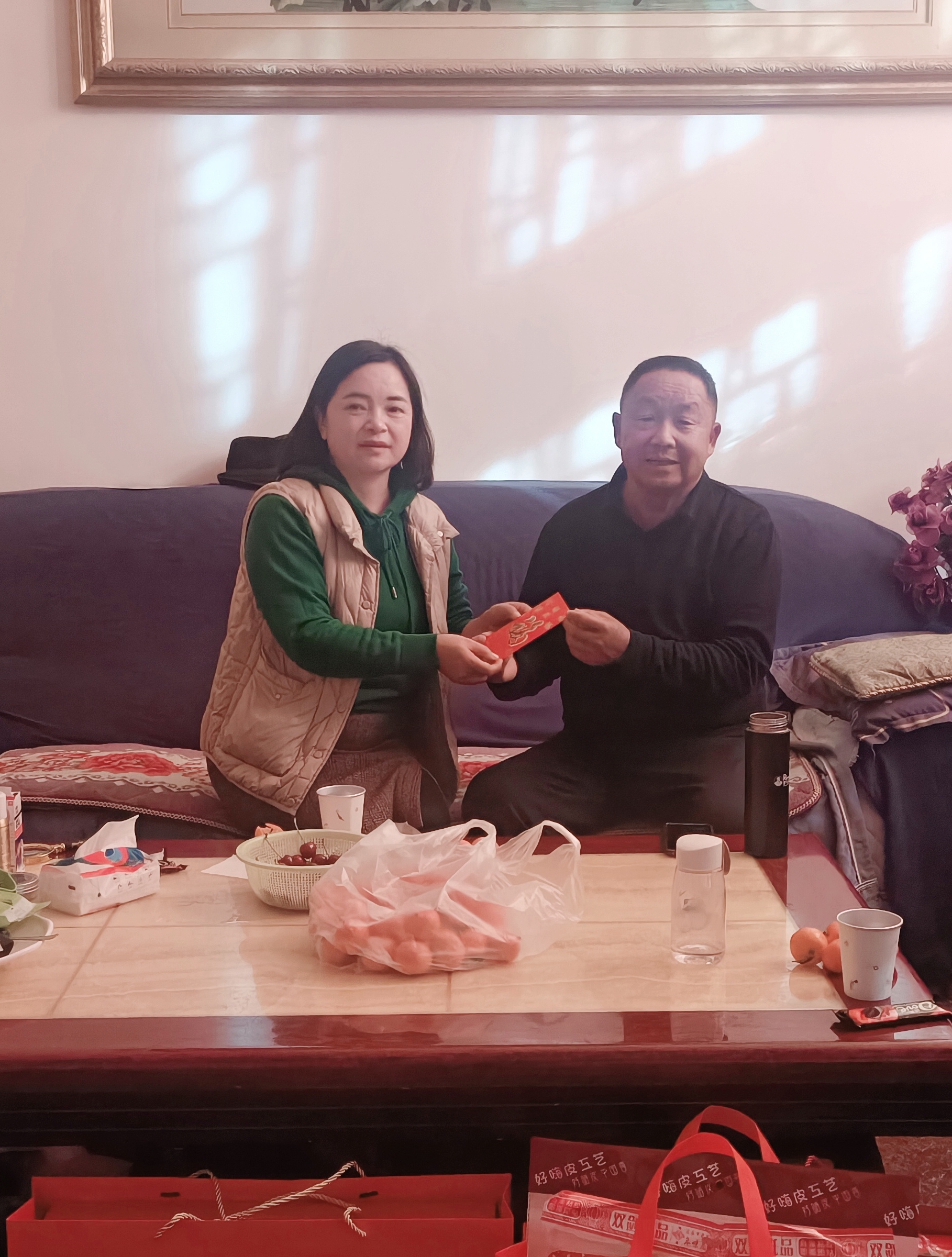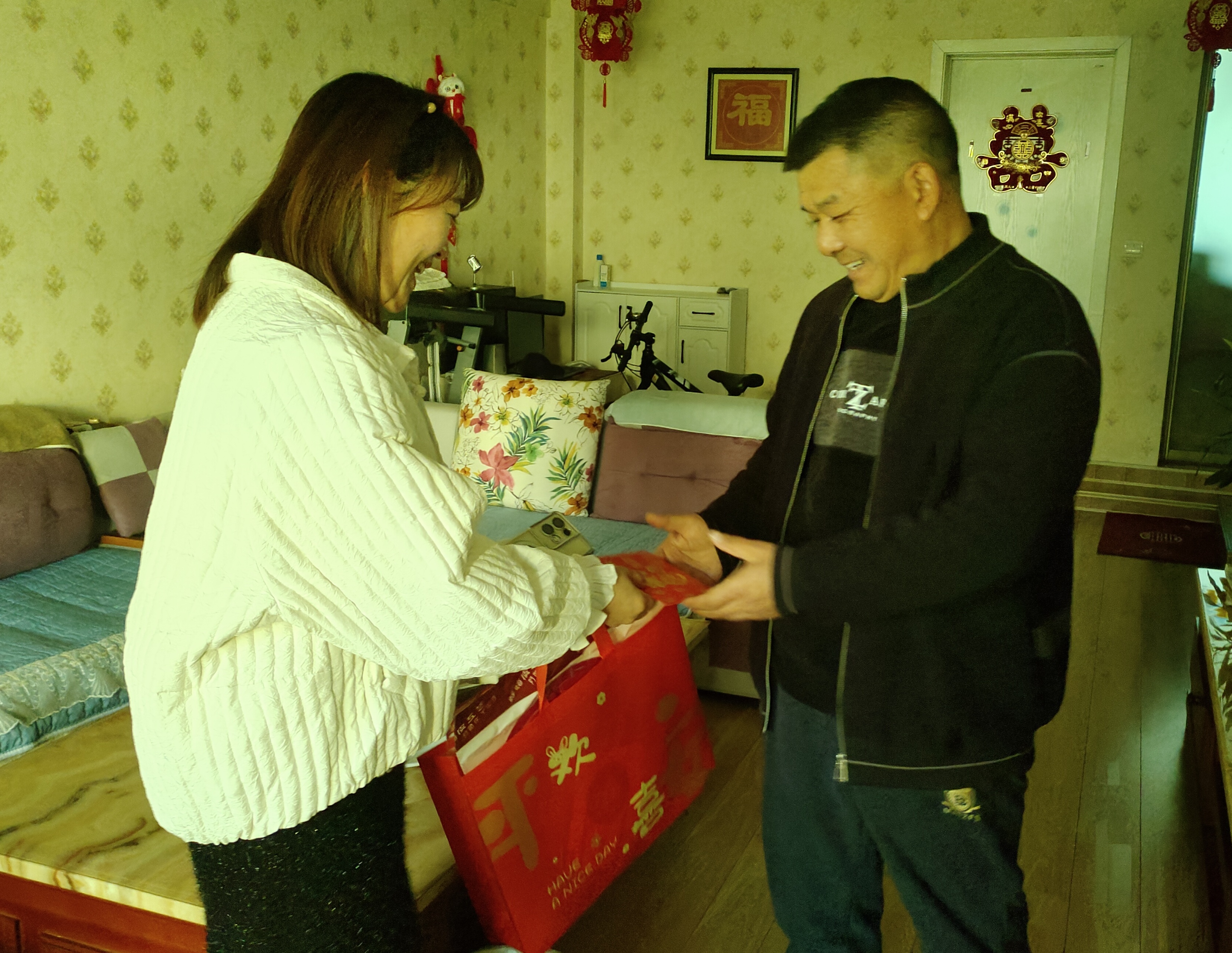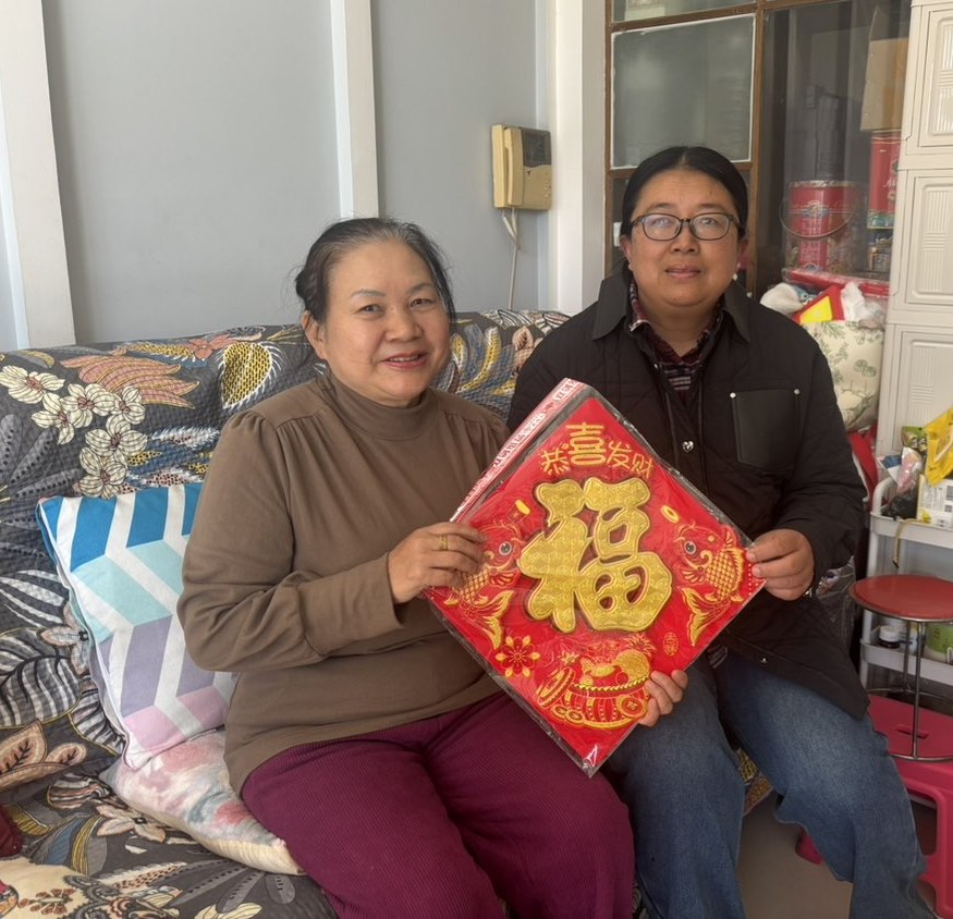 慰问小组为退休教师们送上了精心筹备的节日慰问品:苹果寓意“平安喜乐、福寿康宁”;橙子象征“诸事顺遂、如意吉祥”;福字门贴承载“福满家门、喜事临门”的美好期许;福字中国结缠绕着“团圆美满、吉庆绵长”的新春祝福。这份沉甸甸的心意,既有清甜果香的暖意,又有红韵福泽的喜气,将学校对退休教师的敬重与牵挂,化作看得见、摸得着的温暖,让寒冬里的家充满浓浓的年味儿与温情。