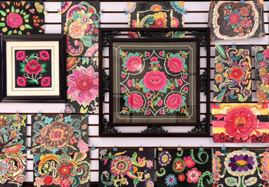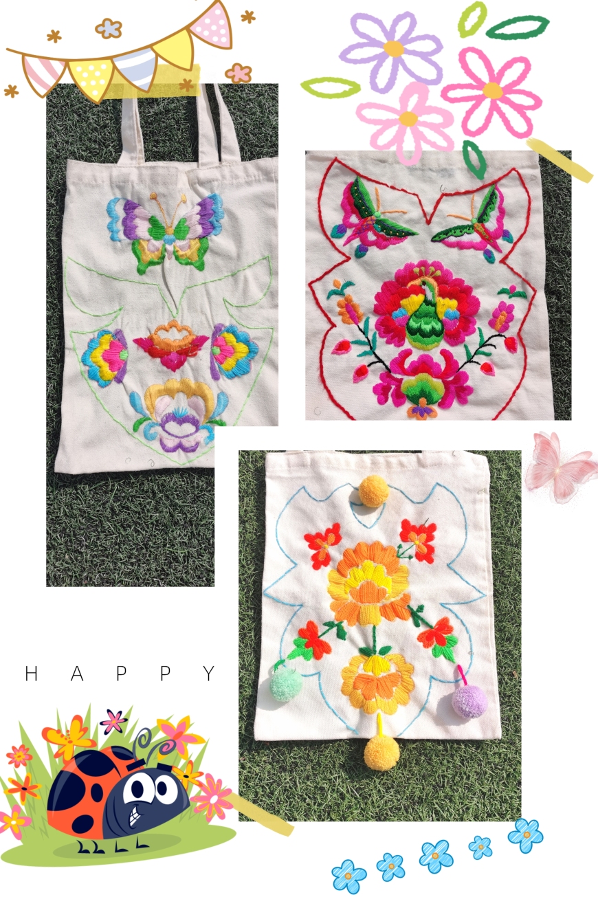 活动进入实操阶段,同学们满怀热忱,迅速进入创作状态。穿针、引线、绕线、落针,每一个步骤都认真细致。尽管部分同学初次接触刺绣,针脚尚显生涩,但大家耐心请教、相互交流,从梳理纹路到填充色彩,逐步摸索、不断调整。指尖的线穿梭交织,一件件初具雏形的作品逐渐呈现,鲜艳的色彩与精美的纹样在布面上绽放,展现出同学们的巧思与匠心。
