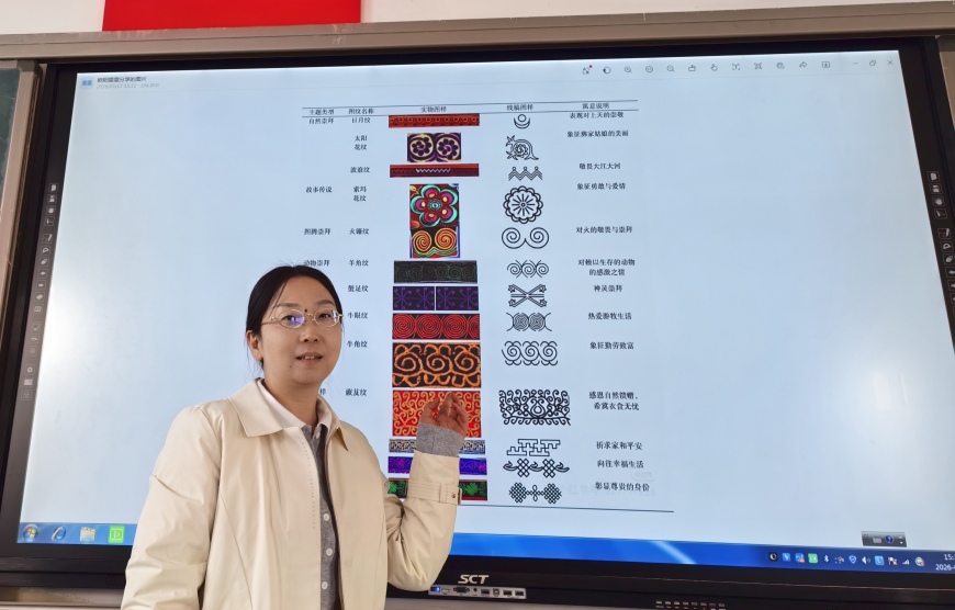 活动伊始,老师通过图文展示、视频播放等形式,为同学们详细介绍了彝族刺绣的历史渊源、色彩搭配及纹样寓意。从鲜艳浓烈的红、黄、蓝配色,到蕴含吉祥祝福的马缨花、火焰纹图案,老师逐一讲解,让同学们深刻认识到彝族刺绣不仅是一门手艺,更是承载着民族文化与情感的“活化石”。