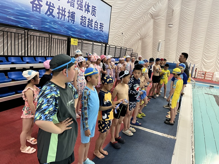 步入泳池区域,湛蓝的池水波光粼粼。训练开始了,孩子们或扶板练习蹬腿,或模仿划手动作,个个学得认真投入。教练在池边耐心指导,细致纠正每一个细节;同学们之间也互相鼓励,交流学习心得。从最初的小心翼翼,到逐渐找到水中的感觉,再到最终勇敢地游出一小段距离,每一点进步都写在孩子们兴奋的脸庞上。水中的嬉戏与训练的汗水交织在一起,奏响了青春活力的乐章。